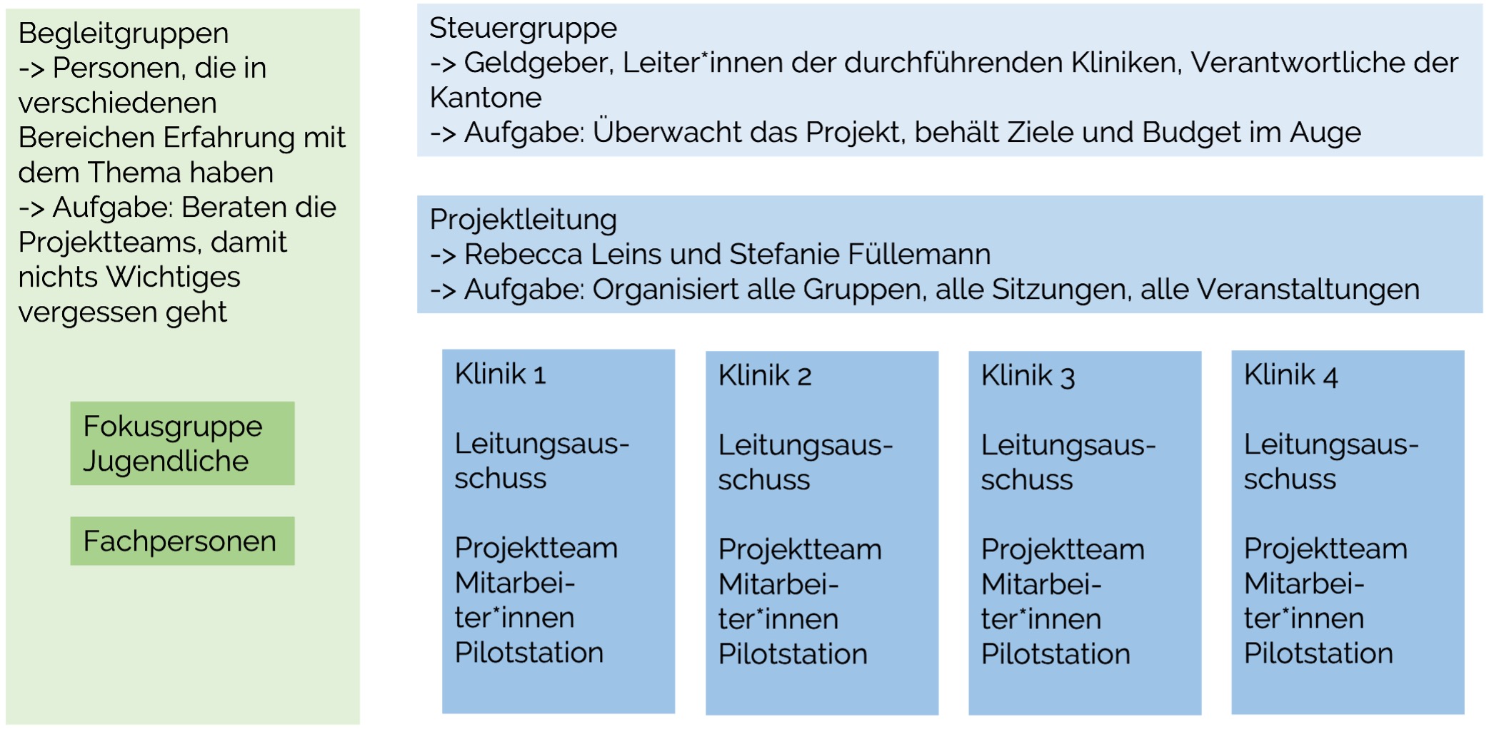 Im Rahmen des Projekts werden in den Kliniken zwei Schwerpunkte verfolgt: Einerseits sollen in den Kliniken Strukturen und Prozesse geschaffen werden, die es den Mitarbeiter:innen der Pilotstationen ermöglichen, das Thema minderjährige Angehörige vermehrt in ihrer täglichen Arbeit zu beachten. Andererseits wird aber auch ein besonderes Augenmerk daraufgelegt, die umsetzenden Mitarbeiter:innen durch gezielte Schulungen und Supervisionen zu unterstützen. Zudem wird im Lauf des Projekts die interdisziplinäre Vernetzung zwischen verschiedenen Akteur*innen der Vorsorge und Versorgung zum Thema Kinder psychisch erkrankter Eltern unterstützt und die nachhaltige Finanzierung der umgesetzten Massnahmen berücksichtigt.